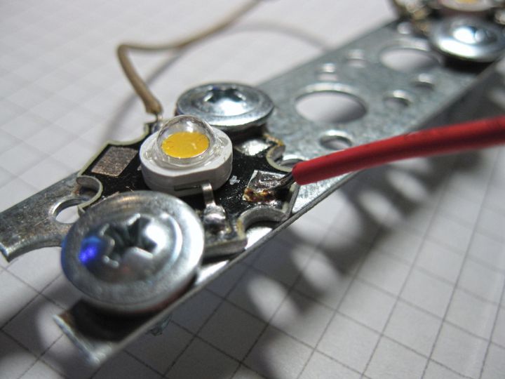 В отличие от привычной нам лампы накаливания, работающей от напряжения, светодиод работает от тока, при этом падение напряжения на нем (фактически это "напряжение зажигания") остается постоянным. Из-за этого приходится снабжать светодиод специальной схемой питания, называемой "LED драйвер", которая обеспечивает постоянство тока. Как правило для этого используются импульсные схемы питания, рассчитанные под различные токи и напряжения, в зависимости от мощности и схемы включения светодиодов: бывают параллельные, последовательные и смешанные схемы. Одной из проблем светодиодов является деградация p-n перехода во времени и, как следствие, уменьшение светового потока с кристалла. www.led-e.ru/articles/svetodiod/2010_4_32.php Также наглядно проявили себя и кристаллы Cree EZR. Имея меньшее напряжение смещения при одинаковом прямом токе (что является одним из основных преимуществ малой толщины примененной подложки SiC) и обладая гораздо большей световой эффективностью, образцы работают в существенно лучших температурных условиях при равнозначном теплоотводе. Также можно сказать и о конструктивных особенностях кристалла (в виде прямоугольника) — его площадь больше, соответственно плотность тока меньше. Все эти факторы положительно сказываются на ходе деградационных характеристик, и можно заметить, что световой поток у этих кристаллов изменился втрое меньше, чем у остальных при прочих равных условиях. И это, прежде всего, подтверждение эффективности применения усовершенствованной технологии производства кристаллов, начатой в предыдущей серии Cree XThin. Для отвода тепла от кристалла светодиоды продаются уже припаянными на так называемых "звездочках", либо просто посаженными на эти звездочки на термопасту. Но это не решает проблемы долговременной работы, т.к. площадь "звездочки" не в состоянии рассеивать ватты тепла дольше нескольких секунд: надо как-то это тепло передавать дальше. Конструктивно - удобно передавать тепло на массивные металлические детали корпуса отражателя, имеющего большую поверхность теплообмена. Промежуточным элементом для лучшей передачи тепла от звездочки к корпусу может служить крепежная перфорированная лента 20x0.5 mm. В качестве деталей отражателя - мне приглянулись оцинкованые профили для гипсокартона: дешево и хорошо поддается обработке. При необходимости увеличения теплорассеивающей поверхности - можно присоединить сверху второй, третий и т.д. профили. ---