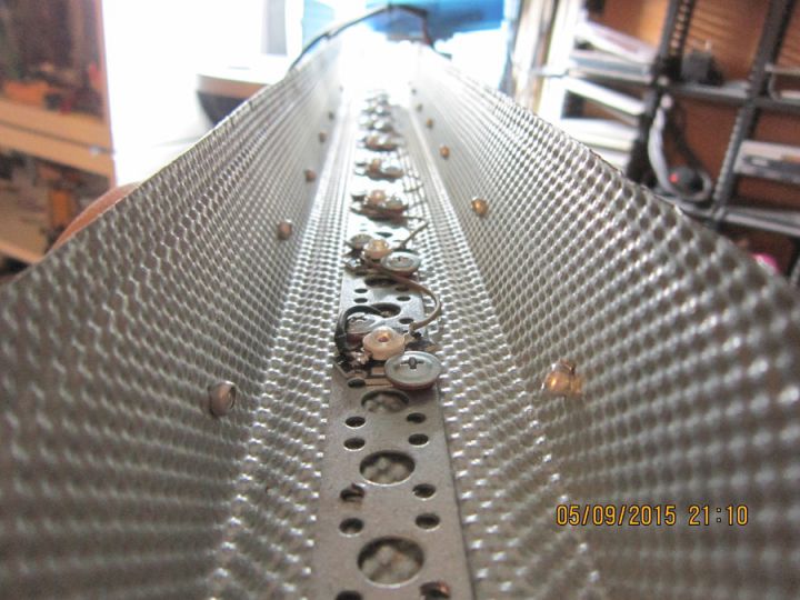 После переделки теплорассеивающих конструкций - сделал двухчасовой прогон с измерением температуры. Один термометр - через отверстие вставлен во внутреннюю часть ближе к перфорированной ленте и светодиодам, второй - в отверстие верхнего ребра "теплообменника". Температура в помещении - примерно 24 oC, расстояние между 3W диодами = 52мм, охлаждающая конструкция состоит из четырех профилей для гипрока (ПН 40х50) стянутых вместе саморезами.