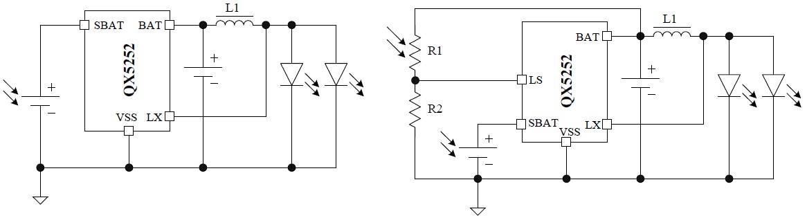 Задумана под использование солнечных элементов/панелей в связке с Ni-Cd аккумуляторными элементами, требует минимальной обвязки: индуктивности. Диапазон рабочих напряжений: 0.9V~1.5V. ( QX5253x/dip-8 is the same but operates from 2 cells). Аналоги: ANA618 (TO-94), 52521H, YX8018 (TO-94), ZE002... При наличии света - заряжает аккумулятор от солнечного элемента, при отсутствии света - включает генерацию и питает светодиоды током, зависящим от величины индуктивности (~150uH = 25mA). При падении напряжения на батарее ниже 0.9V - отключает генерацию и ждет света. English QX5252F datasheet Аналоги и варианты включения на форуме. I found a way to utilize the 5252 in some very useful ways. Типовая схема включения ( считается joule thief like ) для корпусов TO-94 и SOT-23-5 соответственно: ---