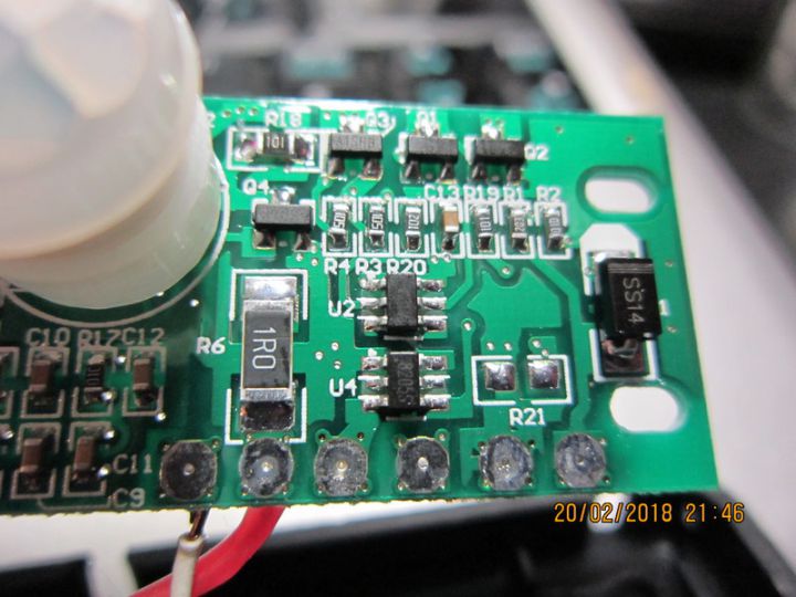 После покупки уличных светильников на Ni-Cd элементах, решил пощупать аналогичную конструкцию, но собранную на Li-Ion батарейке и снабженную датчиком движения. В отличие от никелевых, литиевые батареи не обладают "эффектом памяти" и нет смысла разряжать их до конца: поэтому светильники на базе литиевых батарей снабжены датчиком движения и имеют больше шансов на продолжительную работу в условиях невысокой солнечной активности в осенне-зимнее время. В режиме ожидания - светодиоды запитаны через smd резистор R18 номиналом 100 Ом (101), что, вообще говоря, достаточно ярко. Замена этого резистора на номинал smd 271 - значительно снижает светимость в режиме ожидания, удаление резистора R18 - полностью отключает подсветку. Похожие схемы: https://www.electroschematics.com/11972/motion-sensing-security-light/ ---