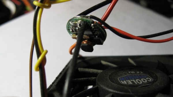 Драйвер немного греется, поэтому я разместил его сверху в зоне движения крыльчатки вентилятора. По опыту нескольких включений со стоящим вентилятором, массы радиатора хватает для рассеивания тепла даже в случае непредвиденной остановки крыльчатки на 10-15 минут.