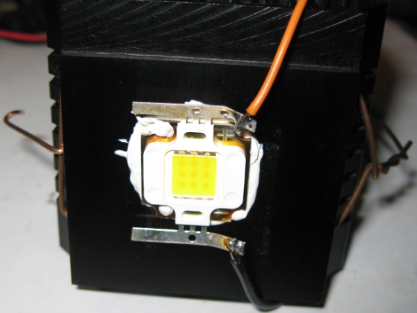 Приклеил термопроводящим клеем матрицу к радиатору от процессора - такое изделие уже можно использовать в качестве 12 вольтовой переноски или освещения рабочего стола. Заявленные 650 люменов - оно дает, и цвет достаточно приятный - похож на лампу накаливания.