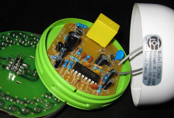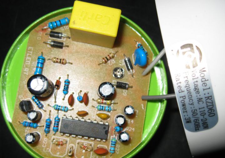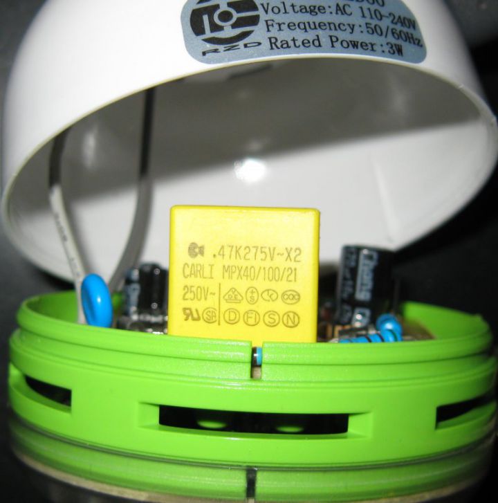 Внутри, кроме традиционно соединенных последовательно светодиодов, целая плата электроники. На входе схемы стоит варистор 07D471K (защита от повышенного напряжения) и конденсатор Carli (для гашения помех). Управление - тиристор BT169D.